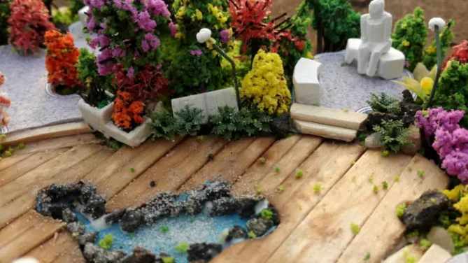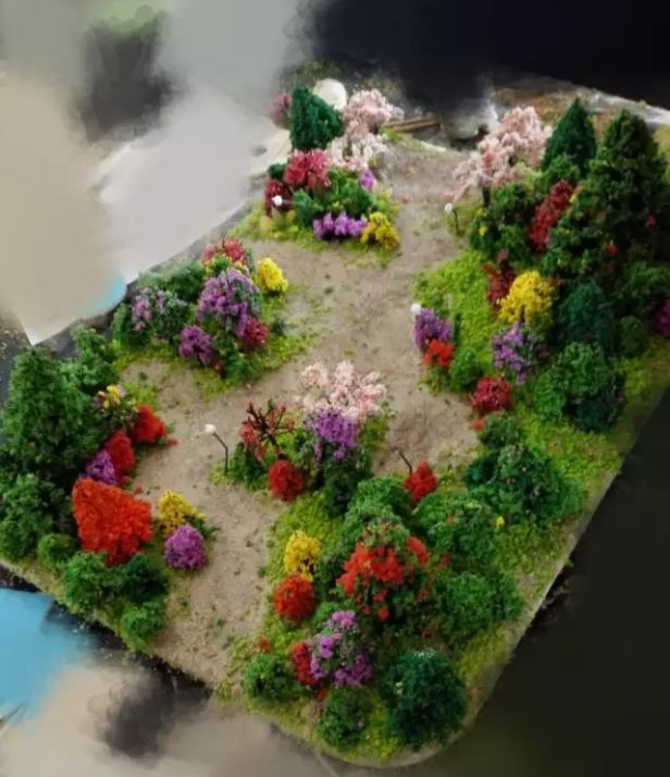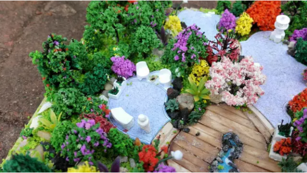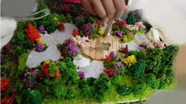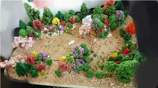 種上自己制作好的各種小樹灌木,調(diào)整好植物之間的層次感、空間感和色彩感,把大致的植物配置先弄好。
