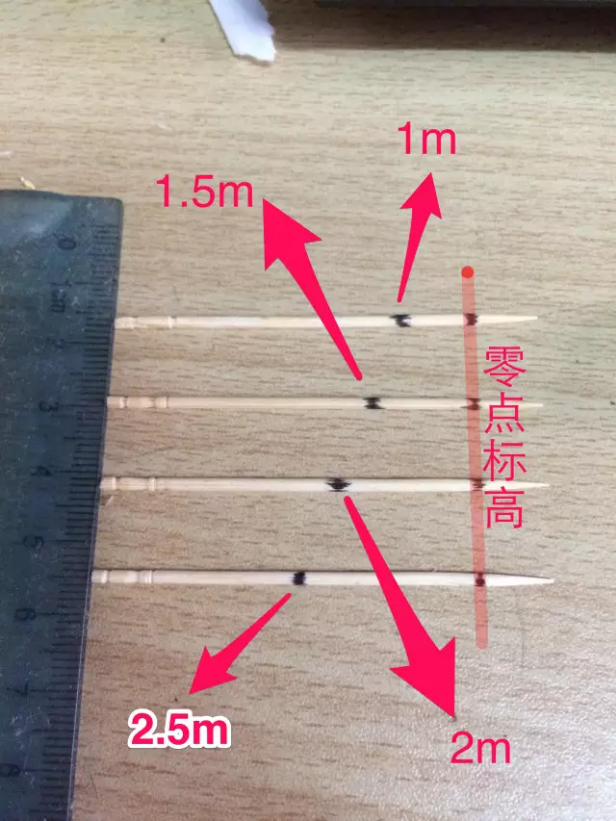 同時,準備幾根竹簽,在竹簽上劃線表示不同標高。(1:100)