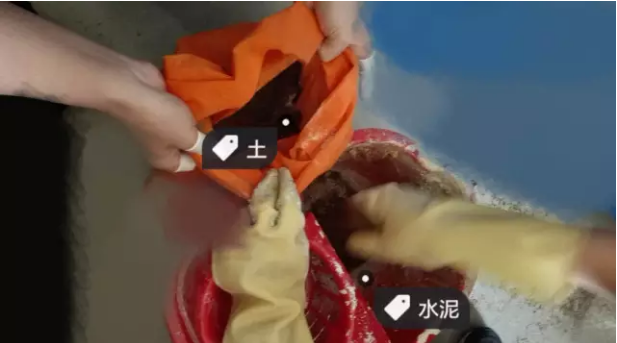 我們用水泥和沙子按1:2的比例混合,加入適量的水攪拌均勻后(加水的時候可以多加點,水少了水泥干的快后面就不容易操作其他步驟了),把水泥倒進另一個干凈的盤子里,鋪平。